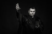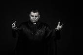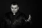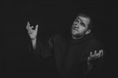 Aktor w przebraniu żebraka na ciemnym tle