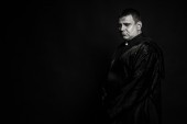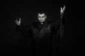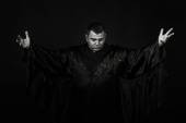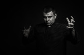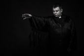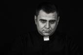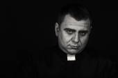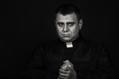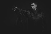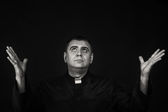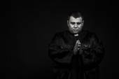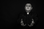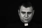Aktor sceny zawodowej w przebraniu księdza na ciemnym tle