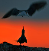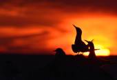 Sylwetka wspólne rybitwy (sterna hirundo) na czerwonym tle zachodu słońca