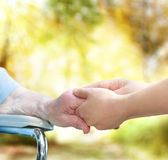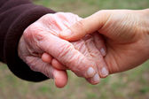 starszy pani trzymając się za ręce z młody dozorca