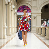 młoda kobieta w czerwonej sukience spaceru w sklepie