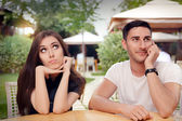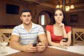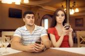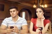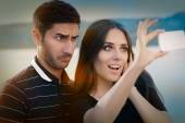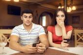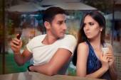 Dziewczyna ciekawy szpiegostwo chłopaka na Smartphone