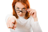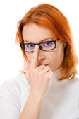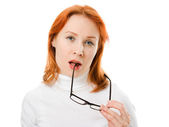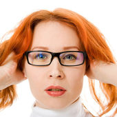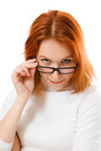A beautiful girl with red hair wearing glasses on white background.