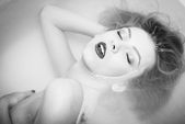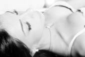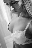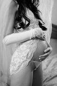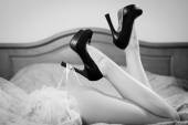 Obraz do spania w łóżku pięknej narzeczonej z sexy nogi w białej bielizny