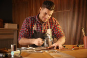 Zdjęcie "szczęśliwy włoski rzemieślnik w pracy, uśmiechając się w warsztacie gitara" może być wykorzystywane do celów osobistych i komercyjnych zgodnie z warunkami zakupionej licencji Royalty-free. Obraz jest dostępny do pobrania w jakości wysokiej rozdzielczości do 5760x3840.