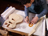 szczęśliwy włoski rzemieślnik w pracy, uśmiechając się w warsztacie gitara