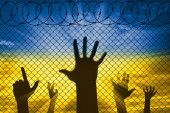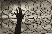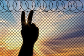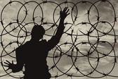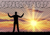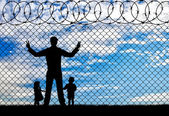 Sylwetka uchodźców ręce w pobliżu granicy ogrodzenia