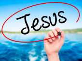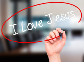 Ręka człowieka pisania I miłości Jezusa z czarnym markerem na wizualne ekranie