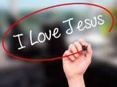Ręka człowieka pisania I miłości Jezusa z czarnym markerem na wizualne ekranie
