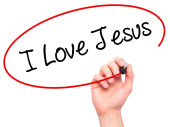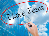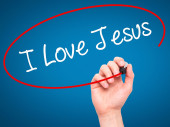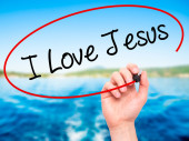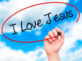 Ręka człowieka pisania I miłości Jezusa z czarnym markerem na wizualne ekranie