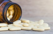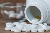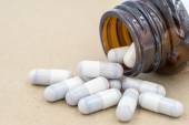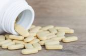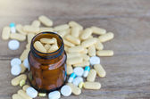 Pigułki lub witaminy w medycynie butelek na tle drewna