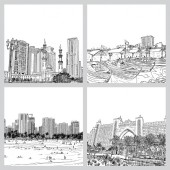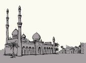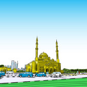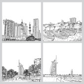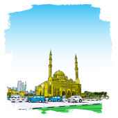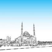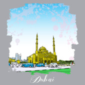 Ręcznie rysowane szkic Meczet z drapaczy chmur w dzielnicy Dubai Marina, Zjednoczone Emiraty Arabskie. Ilustracja, wektor.