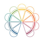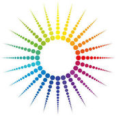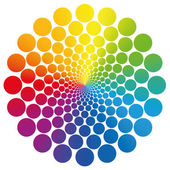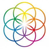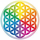 Tęczowe kolorowe Nasiona Życia z płaszczem ochronnym, na białym tle. Figura geometryczna, symbol duchowy i święta geometria. Zakreślające się koła tworzące wzór kwiatu, Kwiat Życia preform.