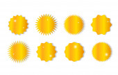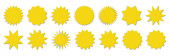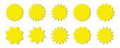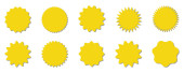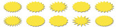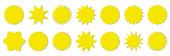 Kolekcja żółtych etykiet. Sprzedaż lub naklejka rabatowa. Specjalna cena oferty. Odznaka promocyjna supermarketu. Wektorowa ikona rozbłysku słońca