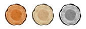 Okrągłe cięcia pnia drzewa w różnych kolorach, cięte sosny lub dębu plasterki, drewno. Widziałem ścięte drewno, drewno. Brązowa drewniana faktura z pierścieniami drzew. Ręcznie rysowany szkic. Ilustracja wektora.
