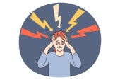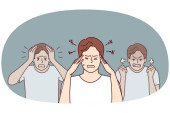 Zdjęcie "Młody człowiek w stresie cierpi na ból głowy lub migrenę. Niezdrowy mężczyzna zmaga się z zawrotami głowy i skurczami. Stres i niepokój. Ilustracja wektora. " może być wykorzystywane do celów osobistych i komercyjnych zgodnie z warunkami zakupionej licencji Royalty-free. Obraz jest dostępny do pobrania w jakości wysokiej rozdzielczości do 5760x3840.