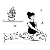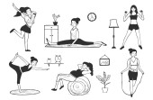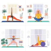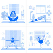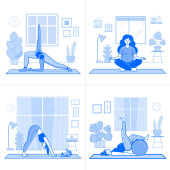 Strona główna Sceny treningowe w linii sztuki z dziewcząt robi wewnątrz jogi lub ćwiczeń fitness. Inna młoda kobieta ćwiczy jogę i rozciąga się w salonie.