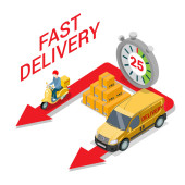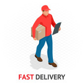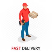 Koncepcja serwisu izometryczne dostawy. Szybka dostawa samochodu, szybka dostawa motobike, człowiek stanie, stoper. Wektor 3d izometryczny ilustracja