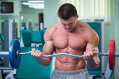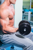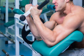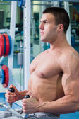 Przystojny, sportowe, pewnie mężczyzna w sali gimnastycznej. Kulturystyka poza