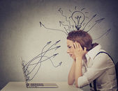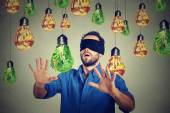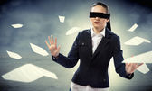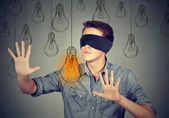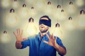 Z zawiązanymi oczami młoda kobieta przechodząca przez żarówki szukają jasnego pomysłu