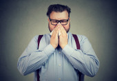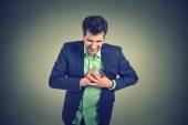 Zbliżenie portret młodego zdesperowany człowiek izolowane na szarym tle ściany