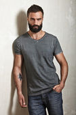 Brodaty poważny człowiek z tatuażem ubrany w szary blank t-shirt i czarne dżinsy, stojący naprzeciwko betonu pustą ścianę. Pionowa, makieta