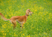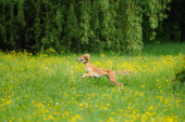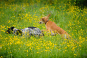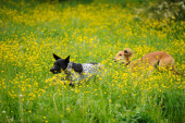 Zdjęcie "Szczęśliwe psy biegną na łące z jaskry" może być wykorzystywane do celów osobistych i komercyjnych zgodnie z warunkami zakupionej licencji Royalty-free. Obraz jest dostępny do pobrania w jakości wysokiej rozdzielczości do 5760x3840.
