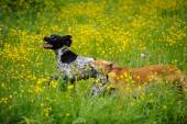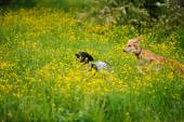 Szczęśliwe psy biegną na łące z jaskry