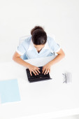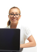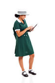 preteen dziewczyna w mundurki szkolne za pomocą laptopa