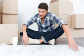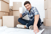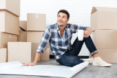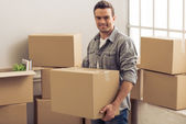 Uśmiechający się zadowolony człowieka, pudła kartonowe, w nowe mieszkanie
