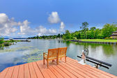 Dom na zewnątrz z drewnianą tapicerką i dużym balkonem. Drzewa wokół.