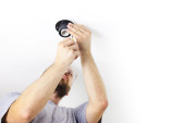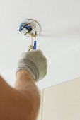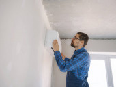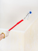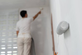 Dekorator rozwiązuje taśmy na ścianie przed malowaniem