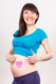 Kobieta w ciąży, trzymając Skarbonka i napis 500 +, program społeczny i polityka w Polsce