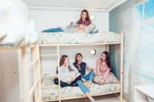 Zdjęcie "Piękne dziewczyny, siedząc na łóżku w hostelu rozmowy i zabawy. Przy użyciu smartfona." może być wykorzystywane do celów osobistych i komercyjnych zgodnie z warunkami zakupionej licencji Royalty-free. Obraz jest dostępny do pobrania w jakości wysokiej rozdzielczości do 5760x3840.