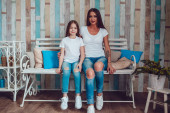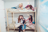 Piękne dziewczyny, siedząc na łóżku w hostelu rozmowy i zabawy. Przy użyciu smartfona.