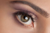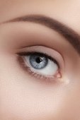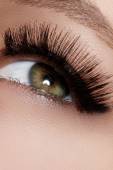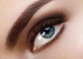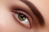 Idealny kształt brwi, brązowe cienie do powiek i długie rzęsy. Zbliżenie strzał makro moda zadymionych oczu visage
