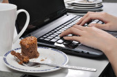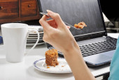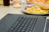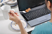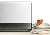 zjeść obiad wśród stosu brudnych talerzy, podczas gdy zajęty i przy użyciu lapt