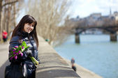 sam brunetka turystycznych kobiet w Paryżu, patrząc na Sekwanie