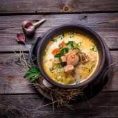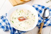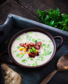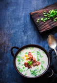 Zupa serowa z boczkiem i kukurydzy w miski ceramiczne. Ciemnym niebieskim tle porysowany.