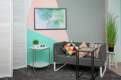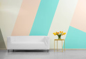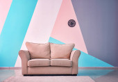 Komfortowa sofa ciemno w pokoju w pobliżu kolor ściany