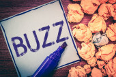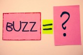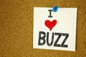 Pisanie tekstu podpisu inspiracji Wyświetlono Buzz pojęciowy ręcznie. Koncepcja biznesowa dla foka Buzz słowa napisane na karteczkę, przypomnienie cork tło z miejsca kopii