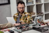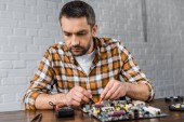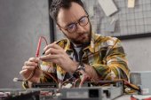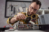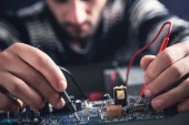 człowiek za pomocą multimetru podczas ustalania uszkodzony komputer