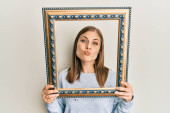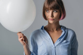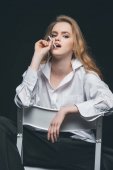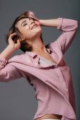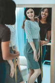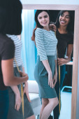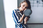 piękna, uśmiechnięta młoda kobieta stojąc w pobliżu lustro i ogląda odbicie
