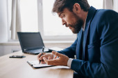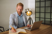 koncentruje się biznesmen w okularach działa na laptopie w miejscu pracy w biurze