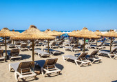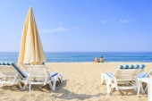 Tropikalnej plaży w Alanyi. Łóżka do opalania i leżakami, na piaszczystej plaży w słonecznym, słoneczny dzień. Koncepcję wakacji letnich. Tropical beach.