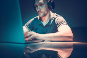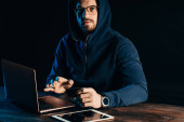 Bluza z kapturem hacker rozwój złośliwego oprogramowania z laptopa w ciemnym pokoju