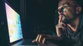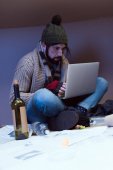 młody hacker rozwój złośliwego oprogramowania z laptopa w ciemnym pokoju
