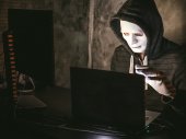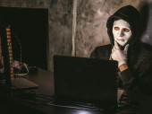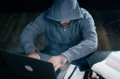Zdjęcie "Widok z boku z kapturem Hacker w masce liczenia skradzione pieniądze w jego miejscu pracy" może być wykorzystywane do celów osobistych i komercyjnych zgodnie z warunkami zakupionej licencji Royalty-free. Obraz jest dostępny do pobrania w jakości wysokiej rozdzielczości do 5760x3840.