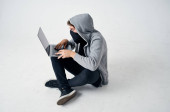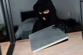 Widok z tyłu z kajdankami hakerów przed jego biurkiem