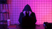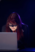 wysoki kąt widzenia młodych kobiet Hacker Rozwój złośliwego oprogramowania pod niebieskim światłem